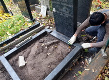 Первым делом мы подготовили могилу к проведению работ: аккуратно извлекли пласты земли с газоном, тем самым освободив цветник.