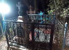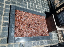 Тем временем мы изготовили табличку, закрывающую лицевую сторону надгробья, а также православный крест, венчающий памятник. Установка этих элементов завершила реставрацию памятника и мы взялись за укладку гранитной брусчатки, оставив в одном из углов участка место под квадратную клумбу. Брусчатку замыли водой и оставили высыхать, в цветник же насыпали мульчу. Окончание работ на данном месте захоронения происходило в тёмное время суток, так как для заказчика срочность благоустройства была одним из решающих критериев при выборе мастеров.