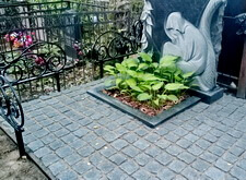 На представленных ниже фотографиях состояние места захоронения на момент прихода клиента. Брусчатка положена, форма цветника и вид оградки изменены. Работа над этим объектом – яркий пример того, как сильно может повлиять на внешний вид участка лишь одно наземное покрытие.